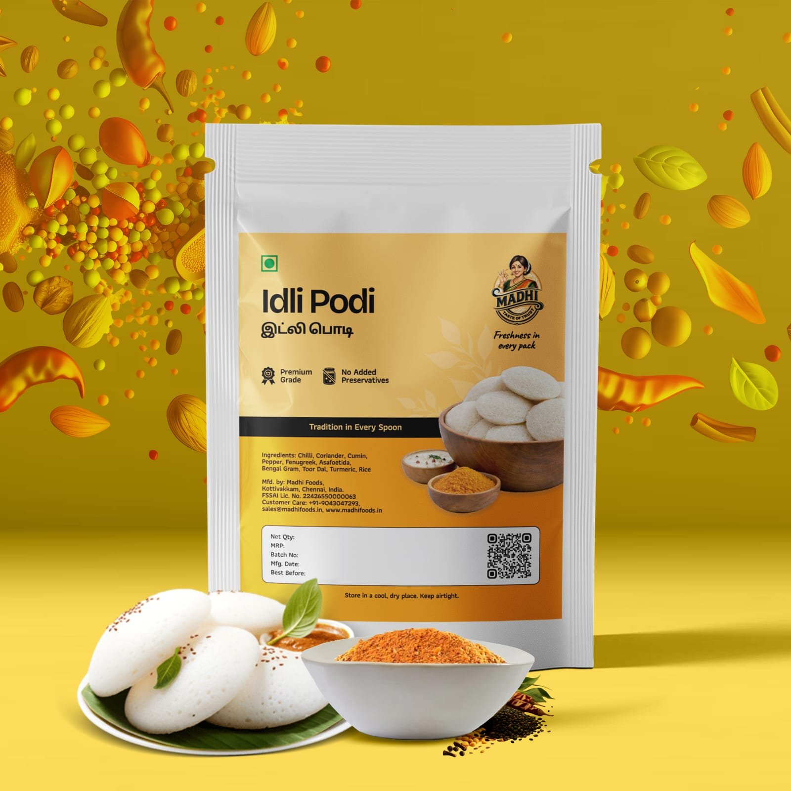 Processed under strict quality control standards, our Idli Podi contains no artificial colors, additives, or preservatives. Hygienically packed to retain freshness and long shelf life, it guarantees consistent quality and traditional taste in every spoon.